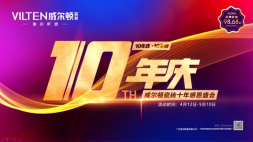 黃金十載,成就輝煌。為感恩新老客戶的支持和信任,4月12日至5月10日,威爾頓瓷磚禮遇相誠,特舉辦“十周年感恩盛會暨百團大戰(zhàn)啟動會”,本次活動以“十年慶·十年情”為主題,旨在回顧威爾頓十年來發(fā)展歷程,...